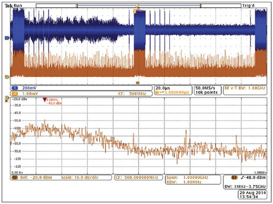 然而,混合域示波器(MDO)的推出使情況有了改觀,它能提供同步的而且與時(shí)間相關(guān)聯(lián)的觀察和測量功能。如圖5所示的這種儀器能夠相當(dāng)容易地讓我們觀察哪個(gè)信號與哪個(gè)EMI事件同時(shí)發(fā)生,從而可以簡化EMI排查過程。